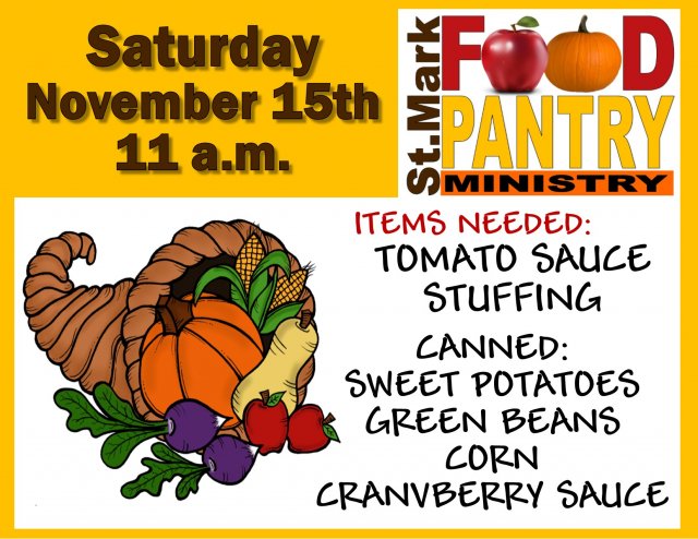St . Mark gathers cans of food and other non-perishable food items for needy families around the area.  Food distribution is on the third Saturday of each month from 11:00 AM to 12:00 PM at the Church Sanctuary Enterance. (For a list of items needed see our monthly newsletter)