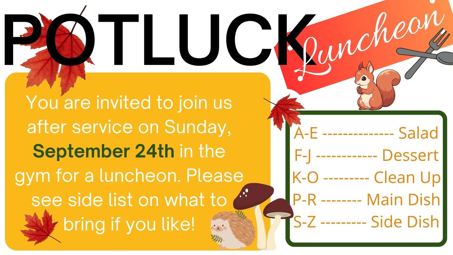 The congregation of St . Mark UMC gathers together at the end of each month for nice fellowship and good potluck food after the service. We welcome you to join us! Food is always plentiful so don't worry if you don't bring anything. There will NOT be a December Potluck due to the Christmas Season!